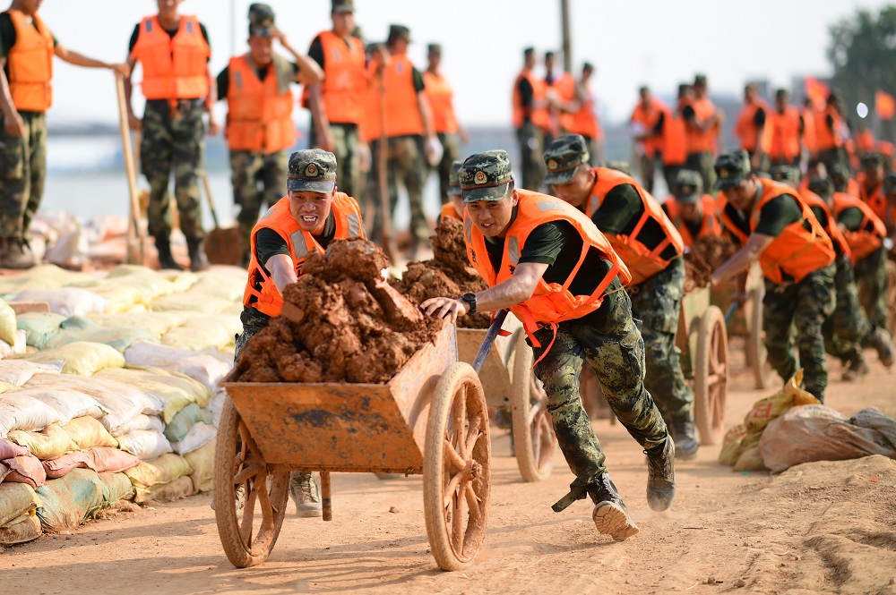 面對嚴重洪澇災害,東部戰區抗洪搶險部隊分別成立了臨時黨委、黨支部,配好配強黨委(支部)書記,組建了上百個黨員突擊隊,發揮先鋒模范作用,讓抗洪搶險更加高效。圖為7月17日,武警江西總隊機動支隊黨員突擊隊奮戰在鄱陽縣昌江圩大堤上。新華社發(曹先訓 攝)