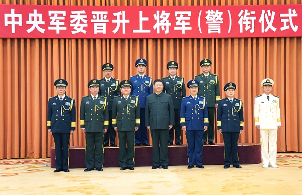 中央軍委晉升上將軍銜警銜儀式18日在北京八一大樓隆重舉行。中央軍委主席習(xí)近平向晉升上將軍銜警銜的軍官警官頒發(fā)命令狀。
