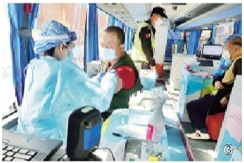 圖③:北京西城,居民在移動新冠疫苗接種車上接種疫苗。