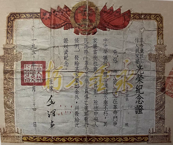 1952年,張伯簡(jiǎn)75歲的母親接到了政府送來的由毛澤東同志簽發(fā)的革命烈士家屬光榮紀(jì)念證,激動(dòng)得老淚縱橫……
