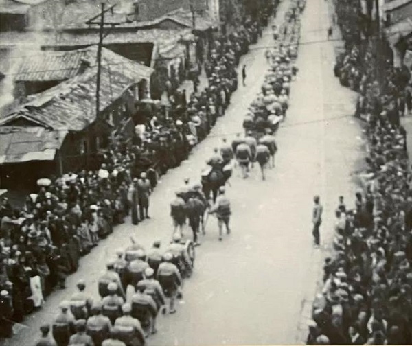 最后是高頭大馬拉著的炮車隊。很多市民是第一次看見真實的大炮,都很激動。炮車隊主要是山炮和榴彈炮。沿街歡迎的群眾手里揮動著小國旗和小彩旗,不斷高呼“熱烈歡迎親人中國人民解放軍!”“毛主席萬歲!”“朱總司令萬歲!”“中國人民解放軍萬歲!”等口號,氣氛十分熱烈。
