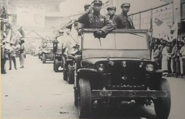 率領解放軍部隊入城的周保中將軍(車上敬禮者)向昆明人民致敬