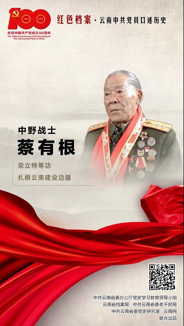 到云南后,蔡有根先在騰沖保衛邊疆,鞏固國防,1956年調往陸良,兩年后又到西盟邊防八團任通訊連副連長,隨后分別在昆明與墨江工作多年。1969年6月,蔡有根轉業至陸良,先后擔任陸良大修廠副廠長、陸良農機化學校書記等職,為建設祖國邊疆做出了貢獻。(馬元西 趙家琦)