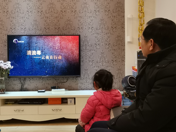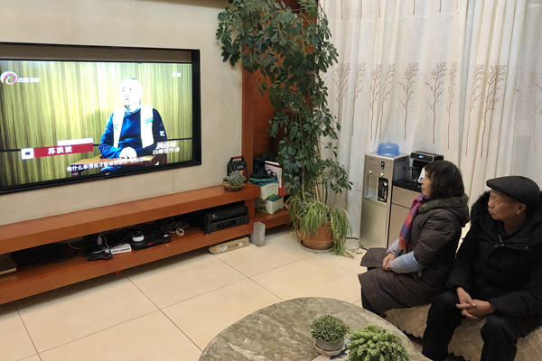 在會澤縣瑞豐社區,老黨員陳家明和老伴一起,收看云南衛視播出的反腐警示專題片《清流毒——云南在行動》。(楊靜 攝)