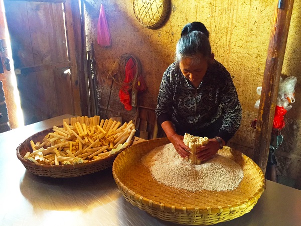 在施甸縣有臘八節熬麥芽糖做糖瓜的習俗,綿軟的麥芽糖反復扯拉,再裹上層層芝麻,待小年之時用來祭灶,以祈禱新年日子甜甜蜜蜜、平平安安。(施霽 攝)