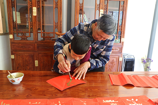筆墨傳福,喜迎新春。臘八過后年味漸濃,爺爺用毛筆手把手帶著孩子書寫新春對聯,在傳承中華民族傳統文化中傳遞美好祝福。(李紅霞 攝)