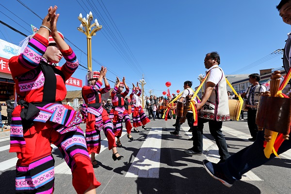 陸良縣大莫古鎮的鄉村趕集日年味漸濃,彝族群眾穿著靚麗的民族服裝,跳起歡快的大三弦,載歌載舞“曬”幸福、迎牛年。(王勇 攝)
