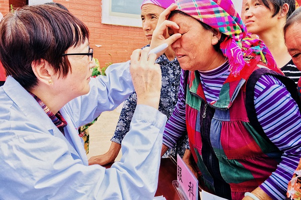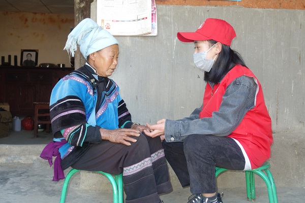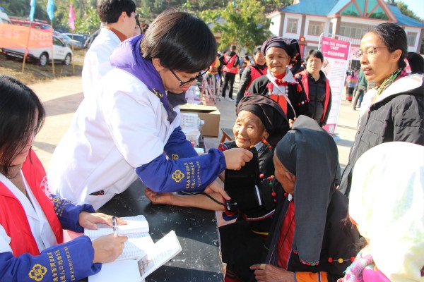 芒市醫療志愿服務隊為村民進行愛心義診。她們用一顆顆躍動的心,完成愛的傳遞。(尨姬萱 攝)
