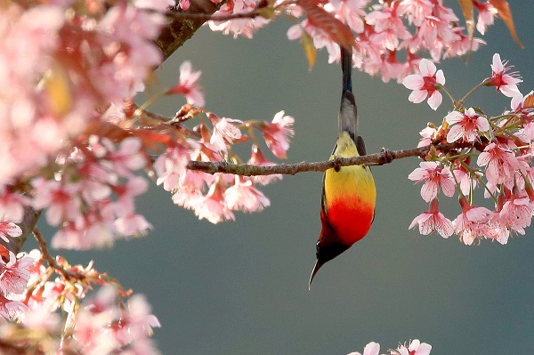 活潑的鳥兒、淡淡的花,吞吐著春意,花枝輕顫,香氣盈懷,擷影重重。(李建國 攝)