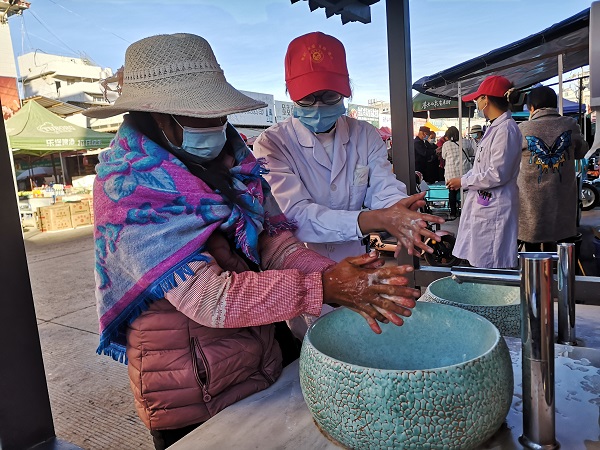 “大媽,您看,洗手的正確步驟是這樣的……”祥云縣衛健系統的志愿者們走上街頭,教群眾七步洗手法,引導群眾養成勤洗手、講衛生的好習慣。(趙秋艷 攝)