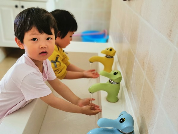 “內外夾弓大立腕”,在東川區金蘋果幼兒園,小朋友每天都按照老師教授的七步洗手法洗手,自覺養成講衛生、勤洗手的好習慣。(朱興鳳 攝)