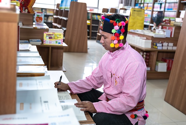 邊學(xué)邊記,一詞一句,開卷有益。德宏州梁河縣的一名阿昌族青年在圖書館一角靜心閱讀學(xué)習(xí),品味著知識的力量。(何成江 攝)