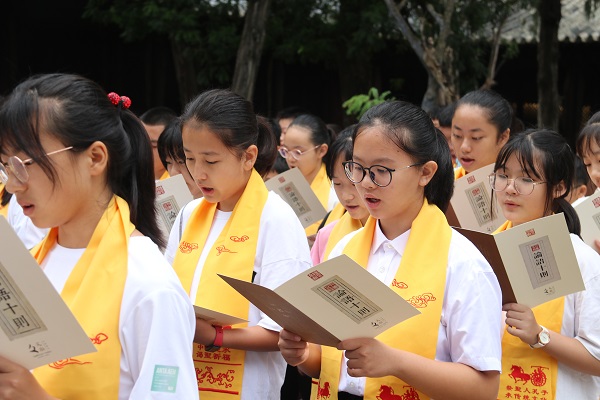 世界讀書日,孩子們在建水孔廟認真誦讀著《論語十則》,跟隨書中的知識開啟一段奇妙的求知之旅。(王虎 攝)