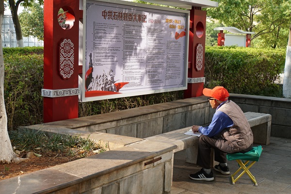 雖身已老,而心如初,雖居廟堂之遠仍不敢忘黨恩。退休老黨員端正坐于石林縣雙龍公園文化長廊,專注重讀黨史,再憶崢嶸歲月。(田哿 攝)
