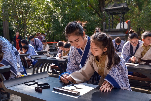 紀(jì)檢監(jiān)察女干部陪著孩子來到文廟,在濃厚的儒家文化氛圍中開啟女兒的人生“第一課”,讓她在第一次書寫“人”字的一撇一捺之中感受學(xué)習(xí)的快樂。(宗慶 攝)
