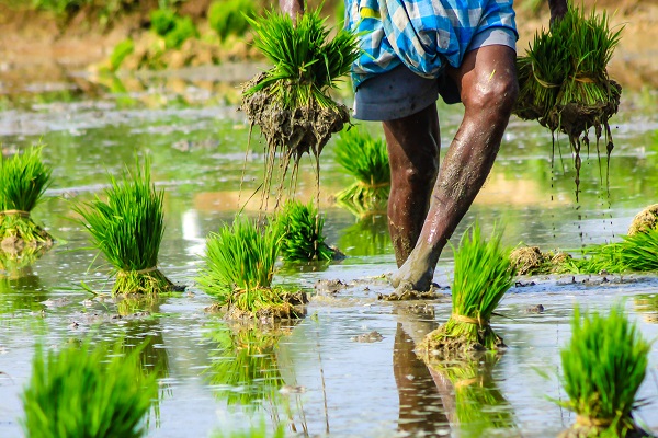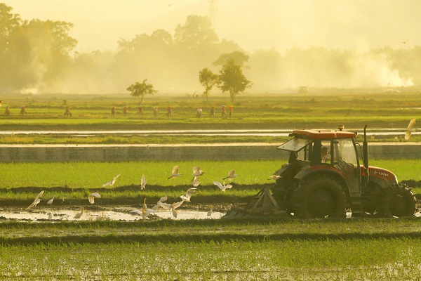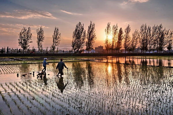 夕陽西下,金色的余暉灑滿秧田,樸實的農家人正在勞作,他們用勤勞的雙手耕耘著秋收的希望。(王建新 攝)。