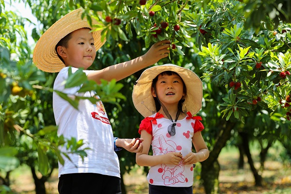 在陸良縣芳華鎮雙合村生態果品園,朱紅而飽滿的楊梅已綴滿枝頭,惹人垂涎,一對可愛的小兄妹正在體驗采摘楊梅,在酸酸甜甜的味道中享受著童年的快樂。(王勇 攝)