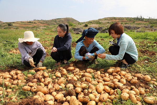 文山市紀(jì)委監(jiān)委把黨史學(xué)習(xí)教育成果轉(zhuǎn)化為為群眾辦實(shí)事、辦好事的實(shí)際行動(dòng),深入田間地頭,了解產(chǎn)業(yè)發(fā)展銷售情況,共同謀劃解題良策。圖為該市紀(jì)檢監(jiān)察干部在德厚鎮(zhèn)小明湖村為村民土豆銷售難想辦法、出主意。(王銘堅(jiān) 攝)