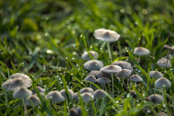 夏日雨后,野生蘑菇撐著“小傘”探出頭來,競相展示裊娜身姿。(李光洪 攝)
