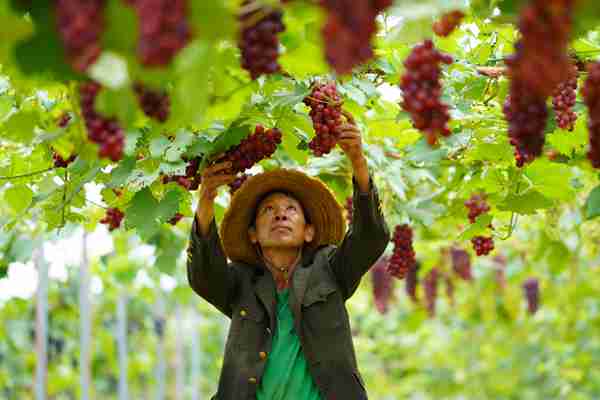 夏至來臨,開遠市羊街鄉(xiāng)老燕子窩村的葡萄迎來了采摘期,一串串飽滿圓潤的葡萄掛滿枝頭,村民們正忙著采摘葡萄。(李海清 攝)