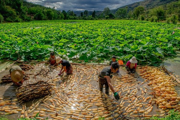 建水縣西莊鎮(zhèn)的荷塘里,村民們將剛挖出來的新鮮蓮藕洗刷干凈并堆放整齊。(梁鑫偉 攝)