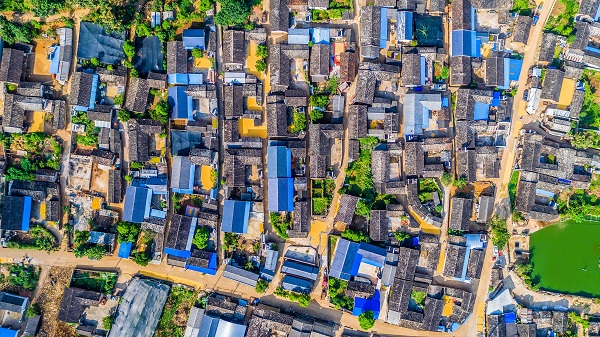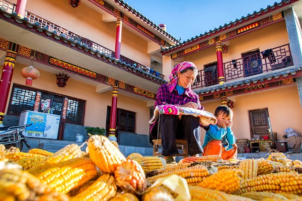 夏末秋初的陽光里,農人將新收的早熟玉米曬滿自家院壩。勤勞的彝族繡娘翻曬之余一針一線地繡著秋天的顏色。(邱建云 攝)