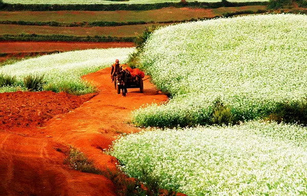立秋蕎麥白露花,寒露蕎麥收到家。秋至,蕎麥花開,在落日的余暉中,農人駕著馬車滿載而歸。(張新民 攝)