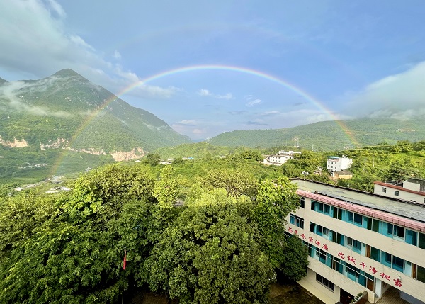 雨后天晴,一道彩虹掛在天空上,“為民務實清廉 忠誠干凈擔當”的字樣在彩虹下格外顯眼。(鄭少飛 攝)