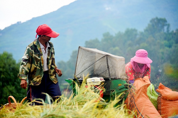 時(shí)至白露,正是中國(guó)各地秋收大忙季節(jié),各種大秋作物已經(jīng)成熟,農(nóng)戶開(kāi)始抓緊時(shí)間收割遲、中水稻。(趙昌能 攝)