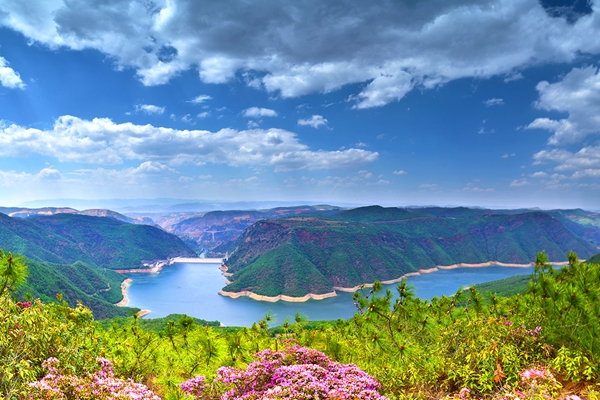 白露時(shí)節(jié),山花燦爛,山色迷人,湖面水平如鏡,微風(fēng)帶著絲絲的涼意,好一幅初秋山水圖。(鄧忠權(quán) 攝)