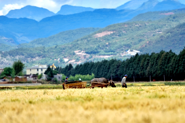 又到一年豐收季,農(nóng)民牽著牛車(chē)來(lái)到金黃的田野,抓住好天氣準(zhǔn)備收割秋糧,空氣里彌漫著豐收的喜悅。(張雪梅 攝)