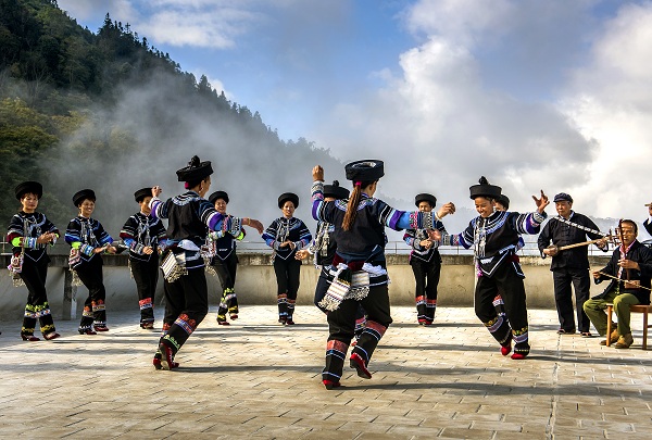秋高氣爽倩云海,山野一片谷穗香,哈尼人家跳起樂(lè)作舞,歡歡喜喜慶豐收。(梁榮生 攝)