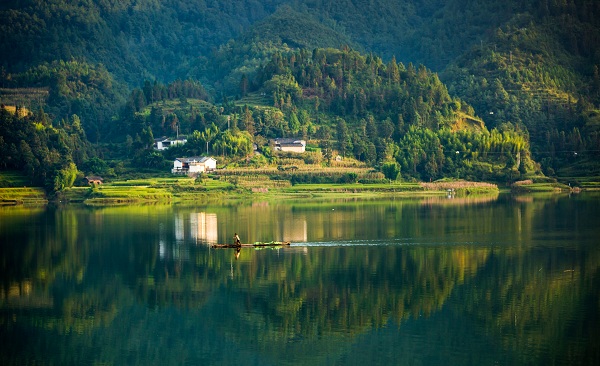 白露初臨,清晨微寒。吱吱呀呀的竹筏劃破一湖秋水,寧?kù)o里帶著靈動(dòng),勾勒出一幅色彩豐滿的秋日畫(huà)卷。(朱昌維 攝)