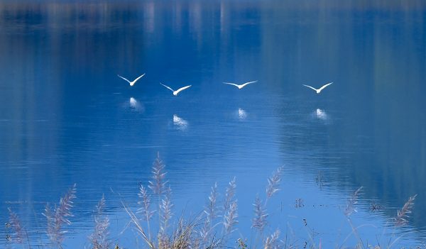 白鷺如白露時(shí)節(jié)的天然使者,蕩起悠閑的“雙槳”,在碧色的湖面上翩翩起舞。(王銘堅(jiān) 攝)