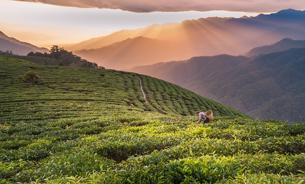 初秋的清晨,高低起伏的山巒上大片大片的茶園郁郁蔥蔥,茶農(nóng)背起背簍正忙著采摘白露茶。(思明 攝)
