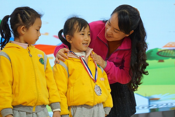 小小運(yùn)動(dòng)員比賽結(jié)束后,老師為小朋友戴上獎(jiǎng)牌,并鼓勵(lì)小朋友“你是最棒的”,為小朋友們的成長喝彩。(蒙基 攝)
