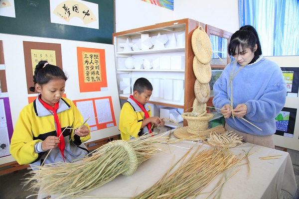 在手工課上,老師耐心地教小朋友們編織稻草,通過做手工,培養(yǎng)鍛煉孩子們的動(dòng)手能力和思維能力。(王官玉 攝)