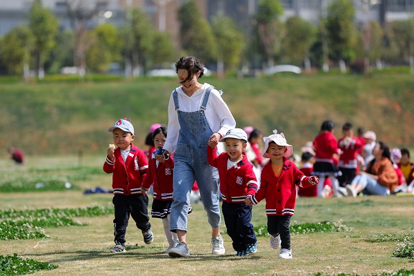 陸良縣貝金岷幼兒園的孩子們?cè)诶蠋煹膸ьI(lǐng)下,來到幸福公園開展戶外活動(dòng),老師和孩子們一同感受自然﹑親近自然,盡享美好時(shí)光。(王勇 攝)