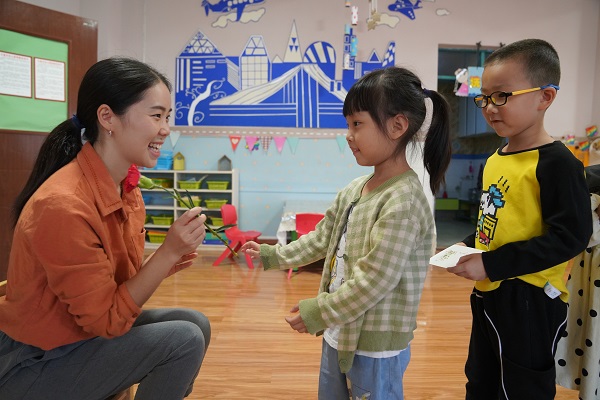 水富市幼兒園的孩子們?yōu)槔蠋熕蜕弦恢Э的塑啊⒁粋€(gè)甜甜的親吻、一張自己制作的賀卡,用簡單而真摯的行動(dòng)表達(dá)對(duì)老師的節(jié)日祝福和由衷敬愛。(狄廷秀 攝)