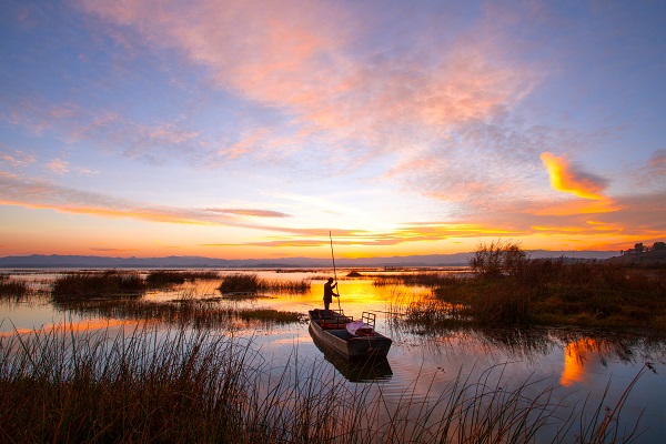 傍晚時(shí)分,太陽(yáng)隱沒(méi)于水面,漁人伴著霞光,撐一支長(zhǎng)篙歸來(lái)。(趙東明 攝)