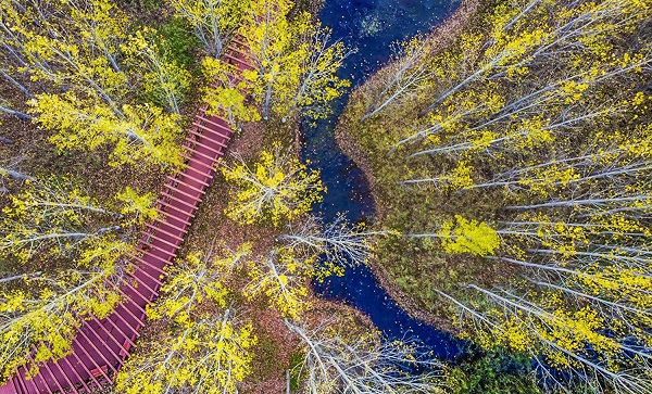秋風(fēng)起,秋葉紅,秋意濃。昆明市甸尾村藏著一幅秋的畫(huà)軸,湛藍(lán)的天空澄澈透亮,河道兩側(cè)的樹(shù)木也置換上了暖色系的外套。(陳向宇 攝)