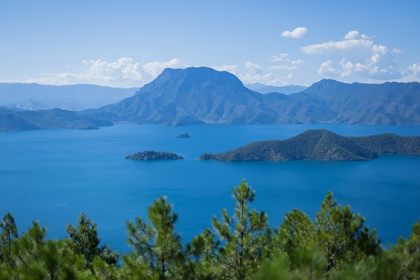 遠(yuǎn)處群山連綿,近處松柏蒼翠,湖面水平如鏡,這是九月如畫(huà)的風(fēng)景。(李盛德 攝)