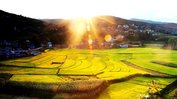 金秋時(shí)節(jié),牟定縣水稻漸次成熟,稻田在夕陽(yáng)斜暉中披上金色的霞衣,展開(kāi)一幅豐收的畫(huà)卷。(黑紹祥 攝)