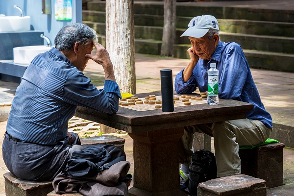 老人們?cè)缭鐏?lái)到公園下棋,享受晚年生活愜意時(shí)光。(王廷彪 攝)