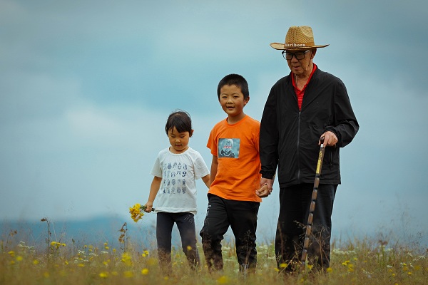 九月九日眺山川。重陽(yáng)佳節(jié),一對(duì)小兄妹陪爺爺在開(kāi)滿野花的山頂上散步。(王勇 攝)