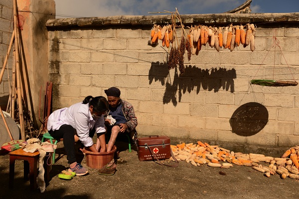 紅河縣甲寅鎮(zhèn)組織鄉(xiāng)村醫(yī)生走進(jìn)空巢老人家中,給老人們義診、泡足、理發(fā)、剪指甲,為他們送去節(jié)日的祝福,讓老人們感受到節(jié)日的溫暖。(王崢 攝)
