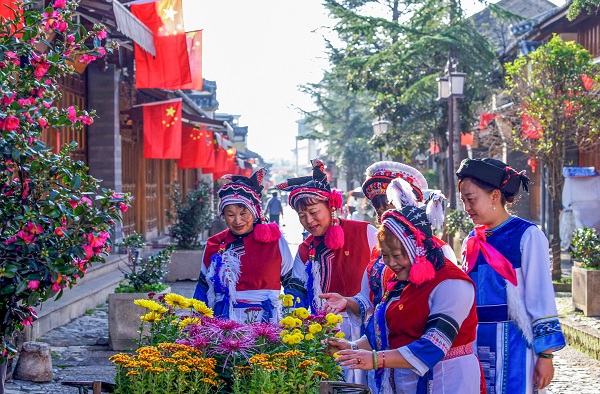 劍川古城里,傲然怒放的菊花成為一道靚麗的風(fēng)景,婦女們身著節(jié)日盛裝一同秋游。(蘇金泉 攝)