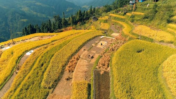 秋日陽光燦爛,墨江縣哈尼梯田遍地金黃,成熟的紫谷翻動著金波,在收割后的田壩上,哈尼老人將豐收的紫谷鋪開,用心翻曬。(羅媛華 攝)