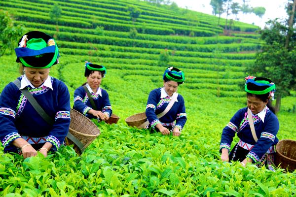 晨曦微露,墨江縣龍壩鎮(zhèn)竜巴村萬畝茶園一片繁忙景象,哈尼族布都支系采茶農家婦女,一邊唱著感謝黨的山歌,一邊采摘著自家改造過后的綠色生態(tài)有機茶。(趙治杰 攝)