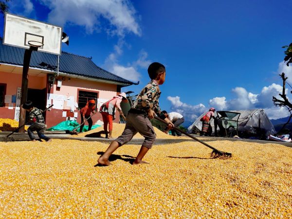 秋高氣爽,艷陽高照,西盟縣勐梭鎮(zhèn)里拉村南梭八組一戶村民家正在曬玉米。金燦燦的玉米映入眼簾,拋灑的是辛勞,收獲的是燦爛。(陳雪櫻 攝)